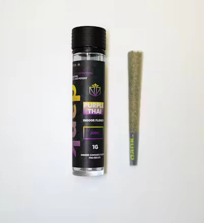 A one gram (1G) pre-roll joint of premium DANK Purple Thai flower rolled in classic joint paper.