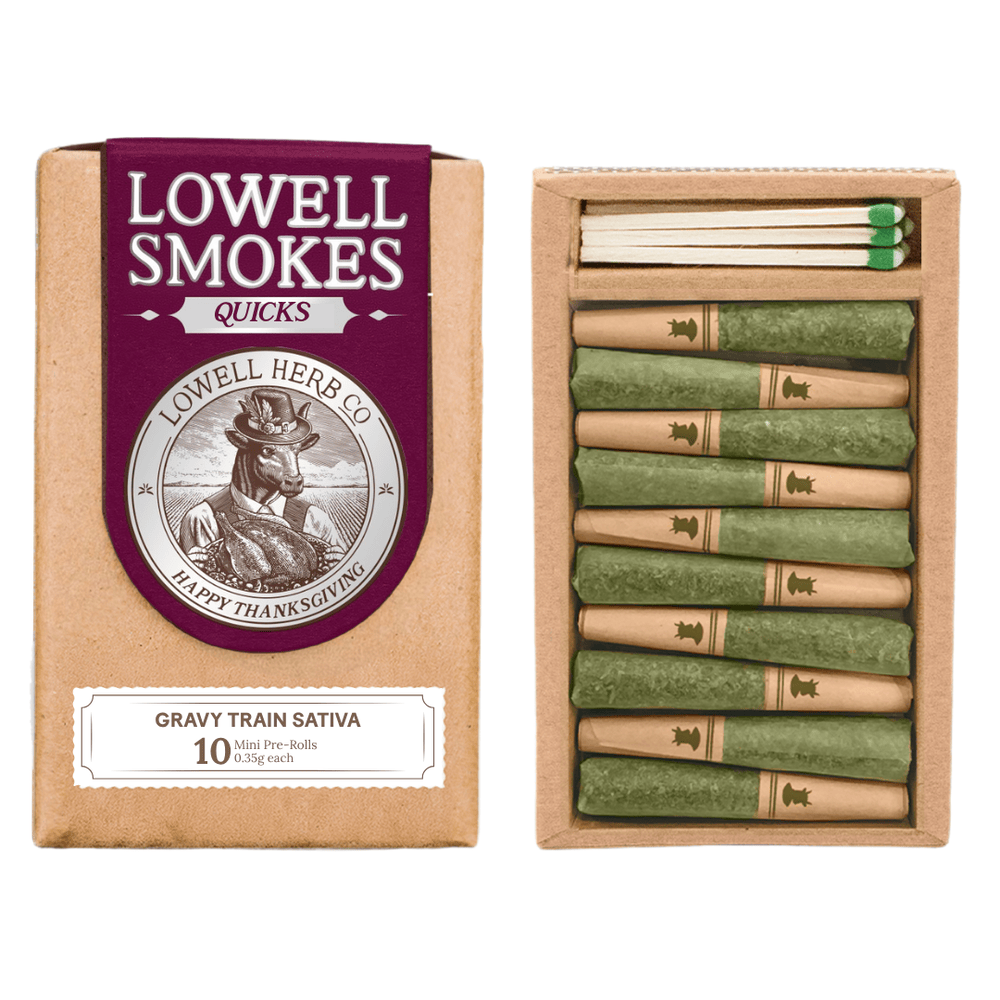 That awkward uncle, the pesky cousin, an untrained dog and forgotten gravy…enjoy it all from your first class seat on the Gravy Train this thanksgiving. This soft-spoken sativa will guarantee that you are at your best around the table with calm self assurance. Dinner is served. The Quicks Pack contains all the elements that made the Originals pack famous but brings a smaller, quick hitting, convenient 0.35g smoke perfect for any on-the-go occasion. The Quicks are ideal for any customer that prefers less cannabis per serving or the connoisseur that is looking to top-up their experience. Each pre-roll pack comes completely self-contained with 10, 0.35g pre-rolls, matches, and a striker, so you’ve got everything you need to spark adventure anywhere. Lowell Herb Co, America's Favorite Pre-roll, crafts high quality, full flower pre-rolls for consumers across the country. Based in Red Hook, NY, Lowell delivers products suited for enjoying anyplace, anytime. Sour Stomper 50%, Harlem 21 Haze: 50%