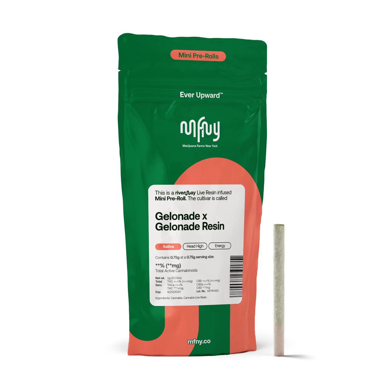 For our resin infused pre-rolls (four-packs), we start with premium, hand-trimmed whole Gelonade flower then infuse it with our in-house made Gelonade live resin HTFSE (High Terpene Full Spectrum Extract from fresh frozen buds) totaling three quarters of a gram in weight. This process creates a higher potency, flavorful product, as Gelonade recalls flavors of the enchanced, sweet citrus, pine, and vanilla. Potent and high in THC, this product is a treat for experienced cannabis consumers. No shake, no trim. Just the very best of our craft cannabis, ready to enjoy. Exclusively single-sourced at MFNY in the Hudson Valley