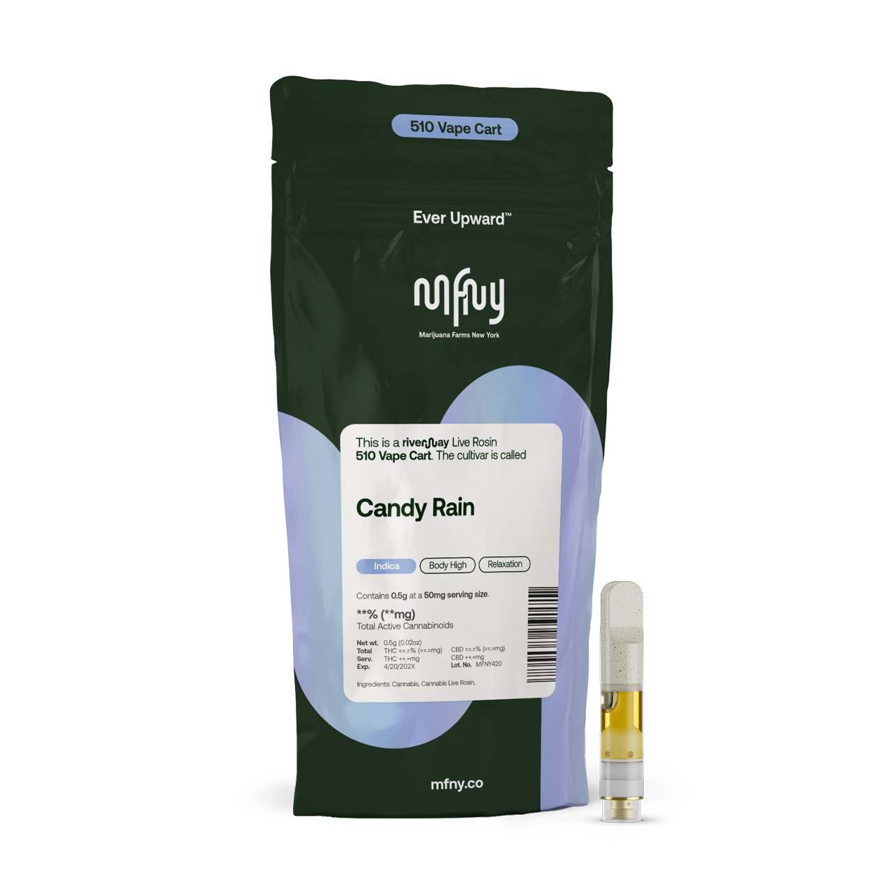 The Riverway Live Rosin Vape has a high terpene profile of our single-source, in-house produced Candy Rain Riverway Live Rosin. We use a proprietary cultivation, freezing, and extraction process designed to preserve flavor, maximize potency, and ensure a truly solventless experience. This solventless extract showcases the cultivar’s naturally produced full-spectrum cannabinoids and remarkable terpenes. Candy Rain is known for its sweet candy aroma and flavor. Potent in THC, it's known to promote a relaxing body high with long-lasting, invigorating cerebral effects that spread to your whole body. No distillates, added flavors, or alterations.