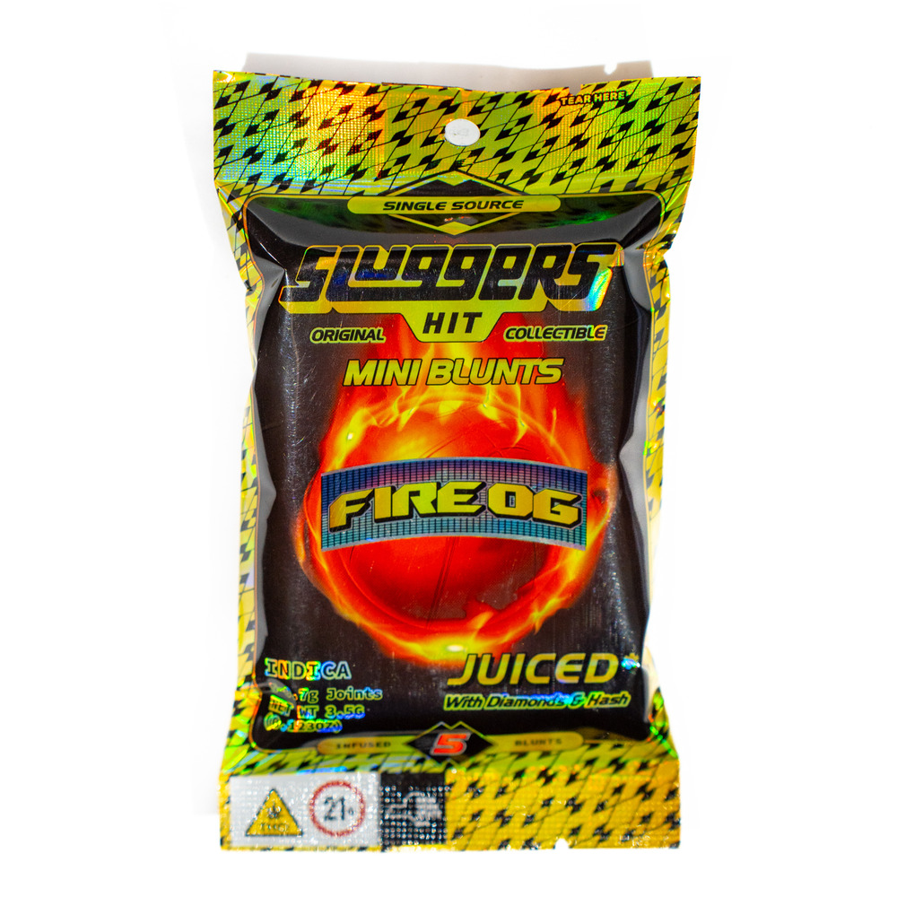 Sluggers JUICED* 5-Pack Blunts come Triple-Infused with Premium Flower, Solventless Hash, Diamonds, High Terpene Extract, and rolled in kief. Each pack comes with 5 hard hitting JUICED blunts and an exclusive collectible card, sealed in an air tight, golden holographic tin and mylar for long lasting freshness and quality. • Single Source • Whole Ground Bud - Never Trim • Quad Infused: with Diamonds, Hash, and High Terpene Extract , and Kief • Rolled in Kief • Blended Hemp Blunt Wrap • Hand Trimmed, Hand Packed • 5pk of 0.7g Joints = 3.5g Total • Collectible Card Inside • Sealed for freshness • Convenient, Air Tight, Tin Introducing the King of all OGs, Fire OG. Fire OG is a hard hitting Indica, combining the best of the OG lineage, crossing OG Kush and SFV OG. Its flavor profile delivers a potent mix of gassy, acidic, and earthy notes that provide a bold and robust experience. This strain offers a deeply relaxing high, perfect for unwinding and relieving stress. (Indica)