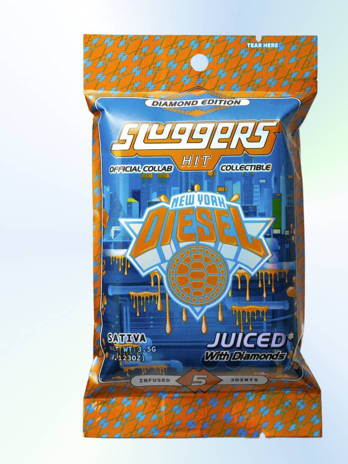"Sluggers JUICED* 5-Packs come Triple-Infused with Premium Flower, Solventless Hash, Diamonds, High Terpene Extract, and rolled in kief. Each pack comes with 5 hard hitting JUICED prerolls and an exclusive collectible card, sealed in an air tight, rainbow holographic tin and mylar for long lasting freshness and quality.